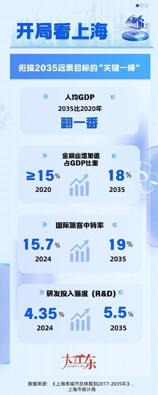 开局看上海。去年底,上海市委八次全会审议通过“关于制定上海市国民经济和社会发展第十五个五年规划的建议”,明确“十五五”将是上海“乘势而上的全面发力期、转型升级的攻坚决胜期”。根据规划,到2035年,人均地区生产总值比2020年翻一番,基本建成具有世界影响力的社会主义现代化国际大都市。